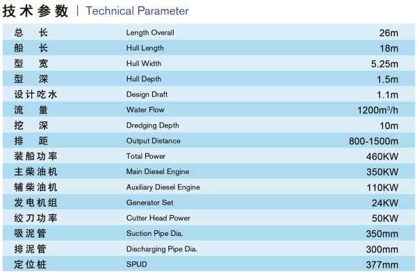 是在疏灘工程中運用較廣泛的一種船舶,它是利用吸水管前端圍繞吸水管裝設旋轉絞頭裝置,將河底泥沙進行切割和攪動,再經吸泥管將絞起的泥沙物料,借助強大的泵力,輸送到泥沙物料堆積場,它的挖泥、運泥、卸泥等工作過程,可以一次連續完成,它是一種效率高、成本較低的挖泥船,是良好的水下挖掘機械。